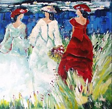 Dames uit de vorige eeuw op weg naar een feest. Imprerssionistisch weergegeven.