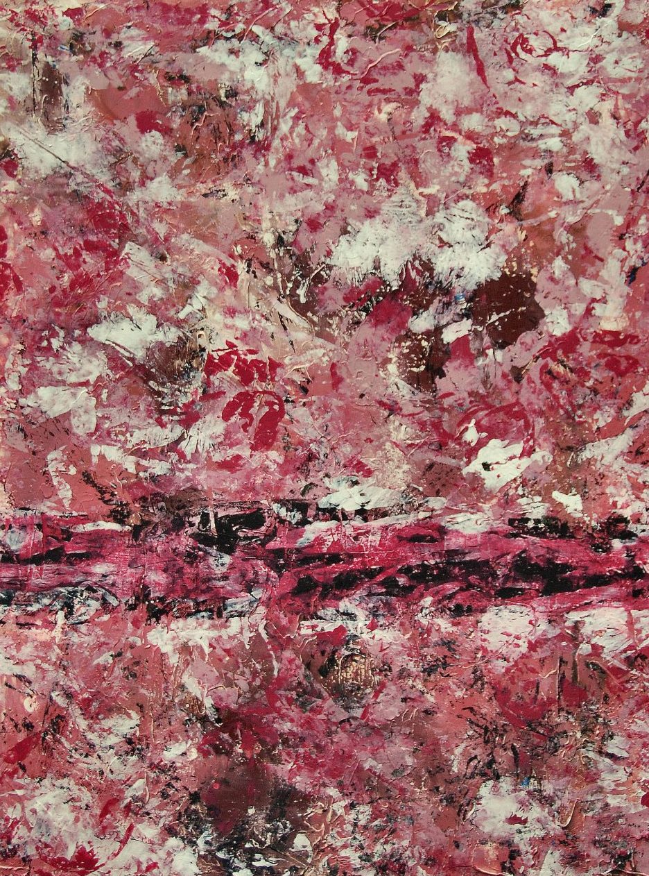 Abstract doek in oud roze tinten, dat zowel in de lengte als in de breedte kan hangen.