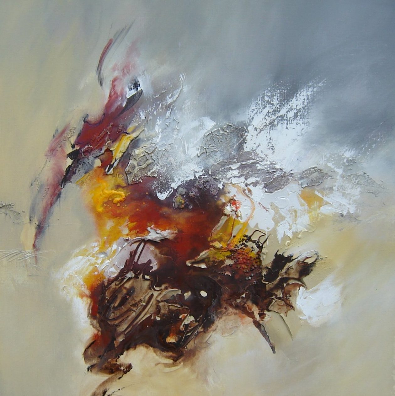 Een globale impressie van het schilderij "Down to earth 6" 100x100cm.
