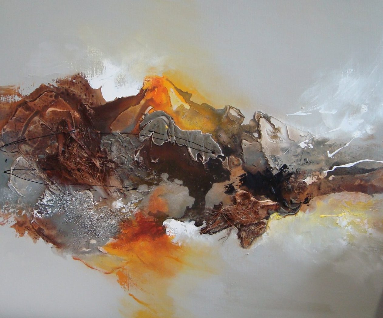 Abstract, materieschilderij, reliëf, stroming, grijs/geel
