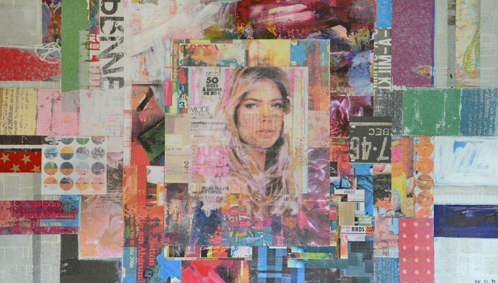 Kleurrijk abstract mixed media schilderij, opgebouwd uit diverse lagen (dekkend en transparant) en met verschillende materialen.