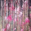 Abstract schilderij waarin ik klaprozen zie waar sneeuw op is gevallen, de sneeuw druipt langs het raam