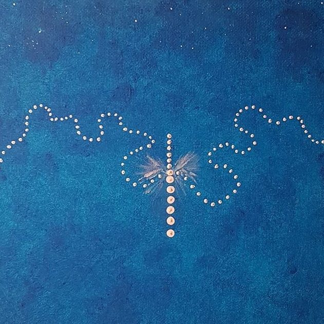 Middernacht blauw - de kleur van dromen en mysterie - is de ondergrondkleur (acryl) van dit symbolisch werk. Het symbool, gemaakt door middel van een stip techniek, vertegenwoordigt verbinding tussen hemel en aarde en de onvoorspelbare weg die we als mens leven. Immers, een levensweg is geen rechte lijn, maar een weg met bergen en dalen, waarbij wij zelf het Licht zijn dat ons vergezeld op onze levensreis. Dit schilderij is onderdeel van een serie van 20 schilderijen, geïnspireerd door de oude Maya astrologie.