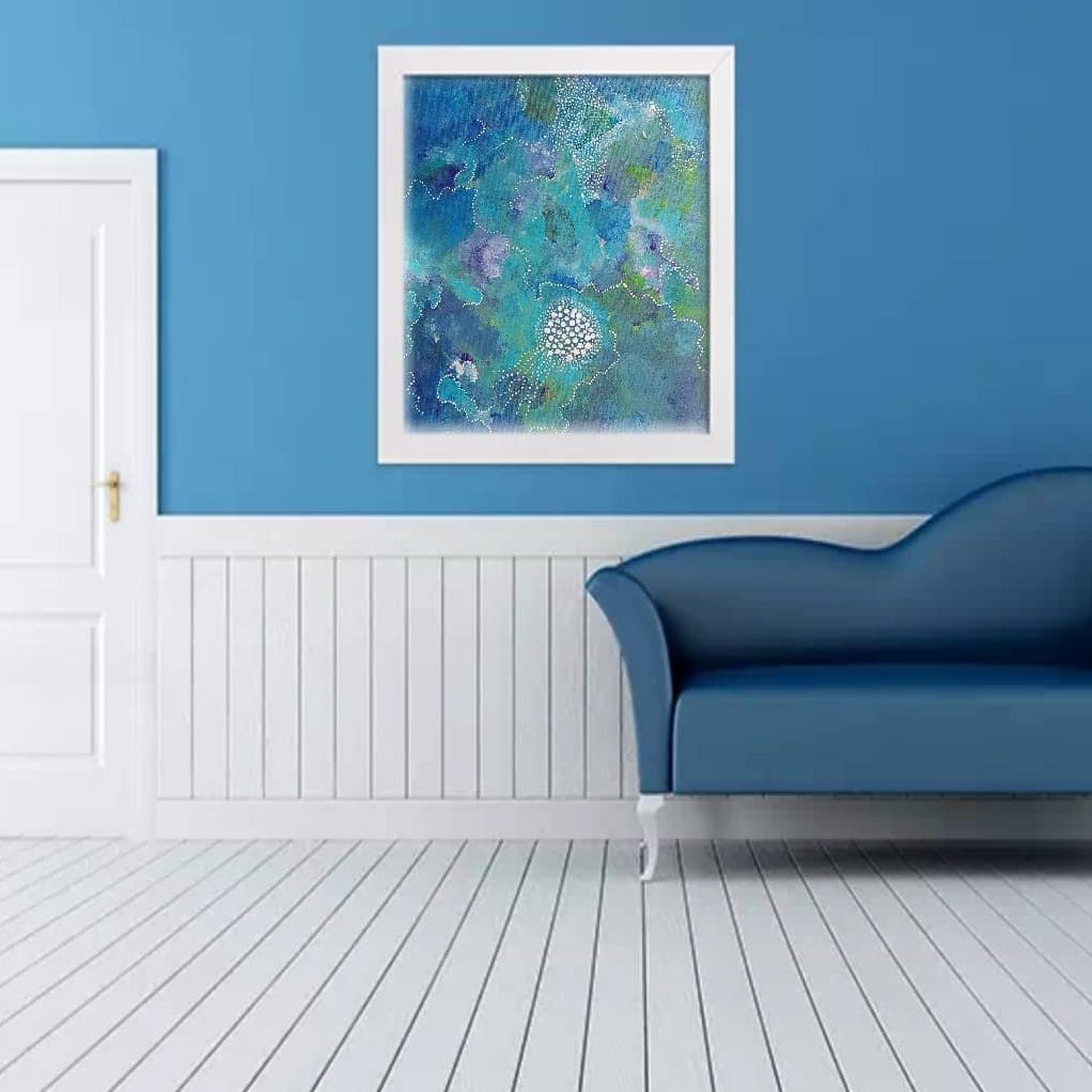 Another piece in my "Underwater" series, in light blue colours. Please note that the size of the painting in the photo is slightly larger than in real life, but it does give a good impression as to the feel of the painting. It can be displayed in four different ways.