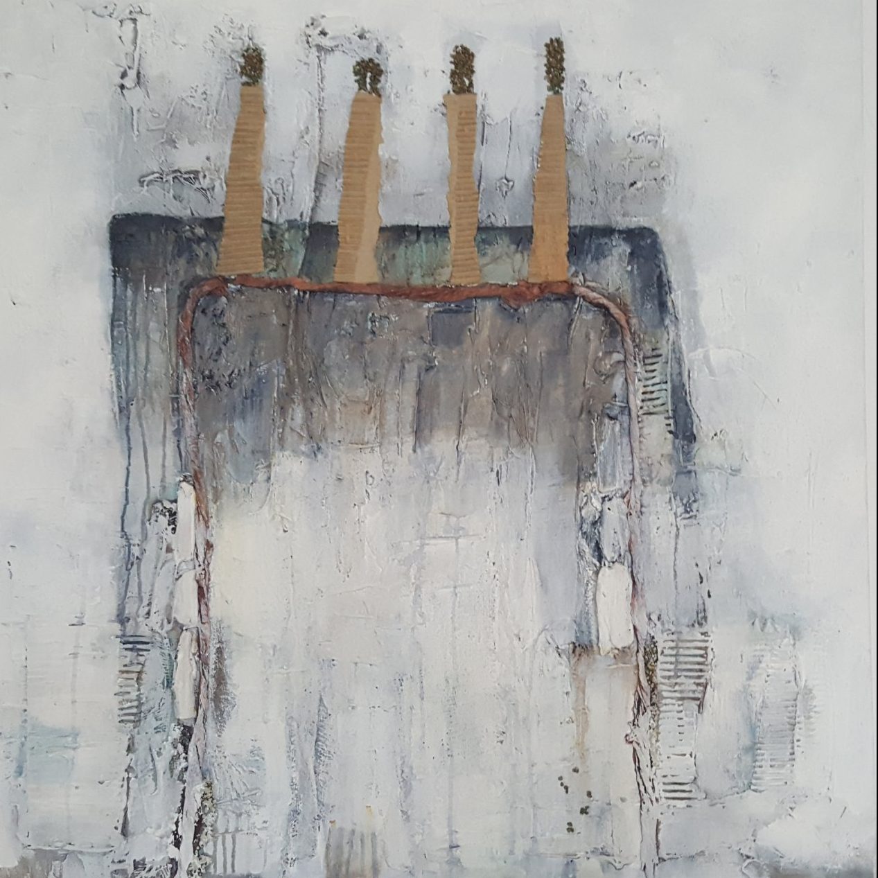 Acrylverf ,modelingpaste,zand,karton,papier,steentjes,hout.