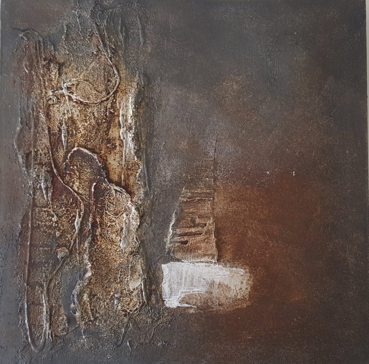 Een klein doek in mooie grijs bruine acrylverf. Ik heb met rusty powder echte roest gemaakt op dit schilderijtje