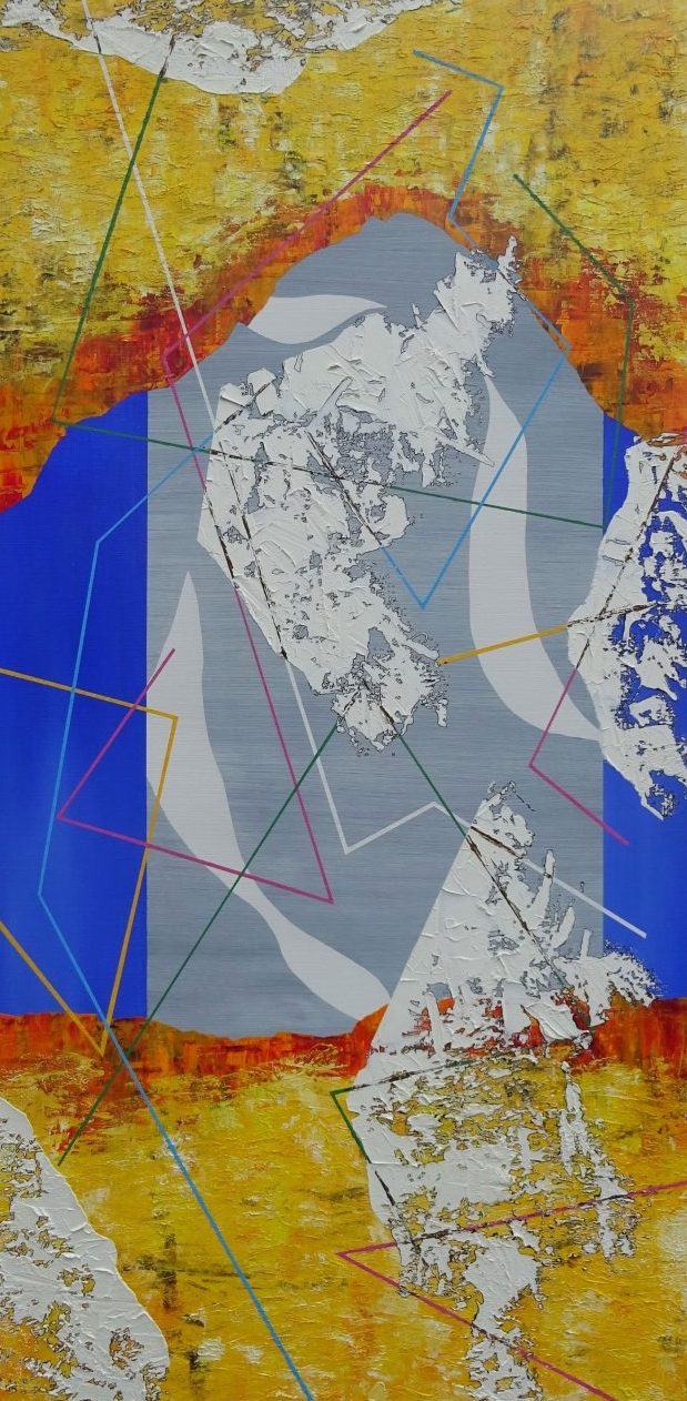 Abstract schilderij uitgevoerd in Olieverf en Inkt op Linnen. Gesigneerd en ingelijst (stalen baklijst). Prijs op aanvraag. Kan zowel verticaal als horizontaal worden geplaatst.