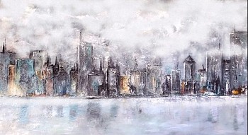 Een globale impressie van het schilderij "Foggy morning shrouded in mistery" 160x100cm.