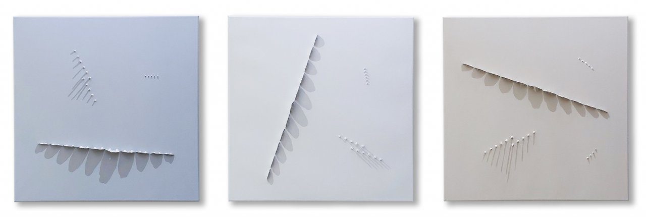 Abstract geometric constructivism. Conceptual piece about light and (double) shadow(s). Indrukwekkend contemporary statement. Warme tinten met wood flakes, rope, acryl en vernis. 3D en mixed media art. Modern design. Eventueel met witte baklijst en gemonteerde lamp (kijk op www.pleu.nl). Zonder lijsten als 3 luik op formaat circa 200x60x8cm. Per stuk: 60x60x8cm. Met lijst: 66x66x8cm. Kom gerust eerst even kijken in Waddinxveen?