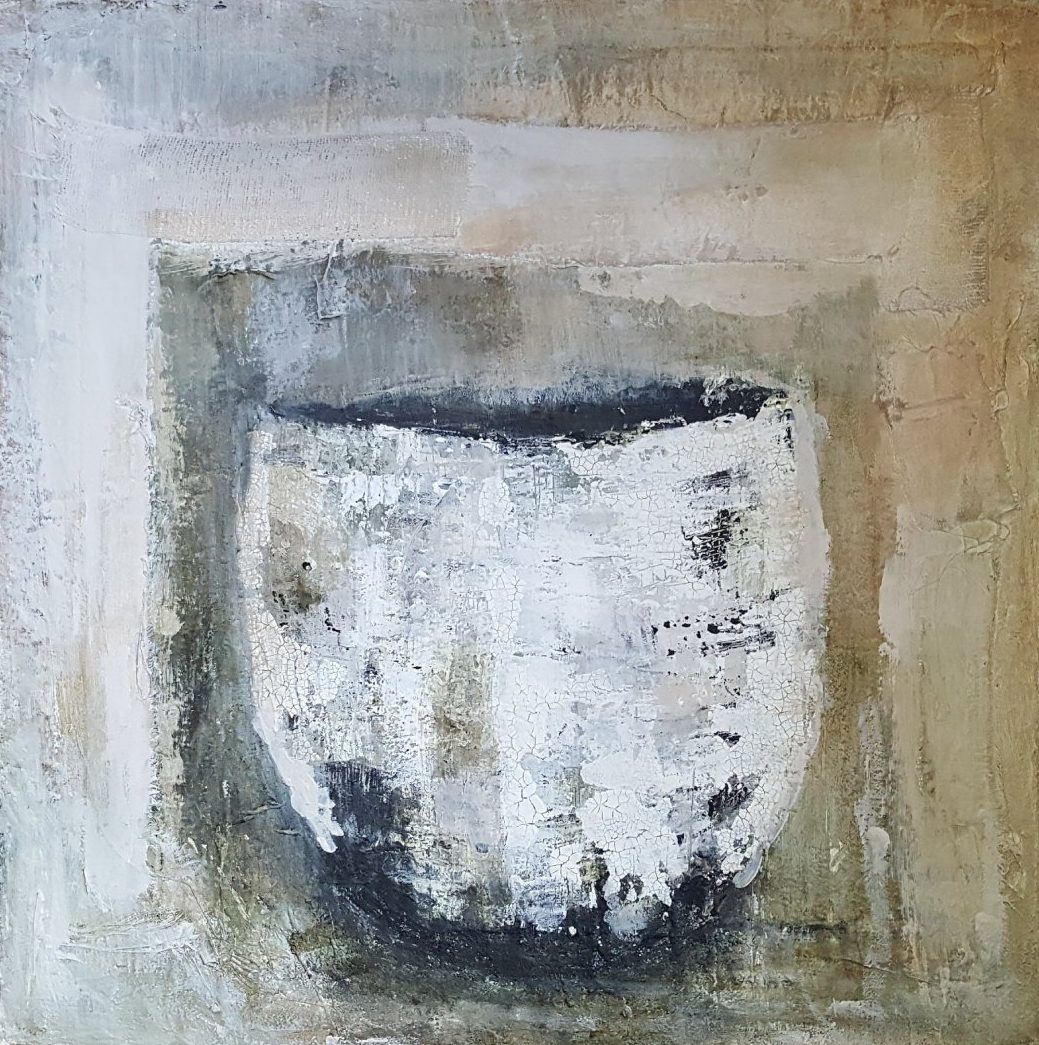 Een mixedmedia schilderij.