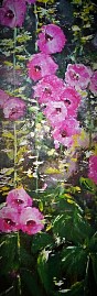 Een globale impressie van het schilderij "Stokrozen" 40x120cm.