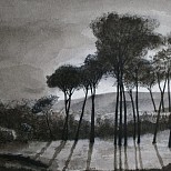 Pentekening, gewassen, Italiaans landschap, mooi ingelijst achter glas