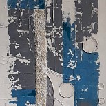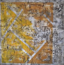 Een rustig, maar rijk gedecoreerd doek, onderkleur beige met bruin en daarover heen twee kleuren geel, onderbroken door strepen