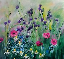 Een globale impressie van het schilderij "Wilde bloemen" 100x100cm.