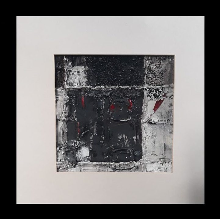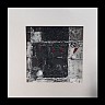 Klein Squary zit in een lijst met gebroken witte passe partout en zit in een zwarte lijst waarvan de maat 44 bij 44 cm. is.