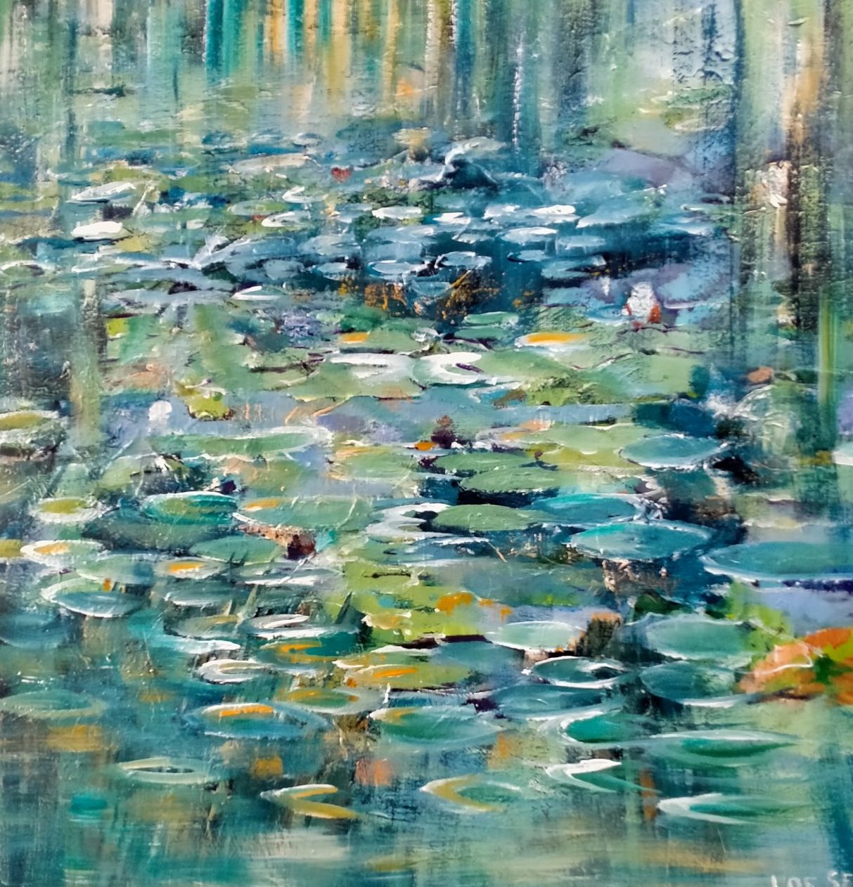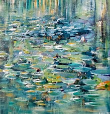 Een globale impressie van het schilderij "Waterlelies" 100x100cm.