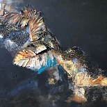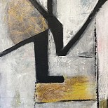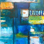 Gelaagd opgebouwd met olieverf en coldwax op 70×70 cm paneel met zwarte baklijst.