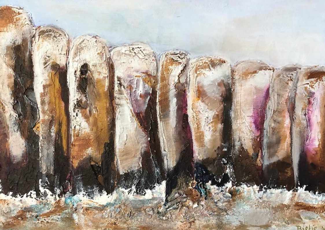 Mixed media op 50×70 cm doek. Afwerkt met vernislaag en in een handgemaakte baklijst.