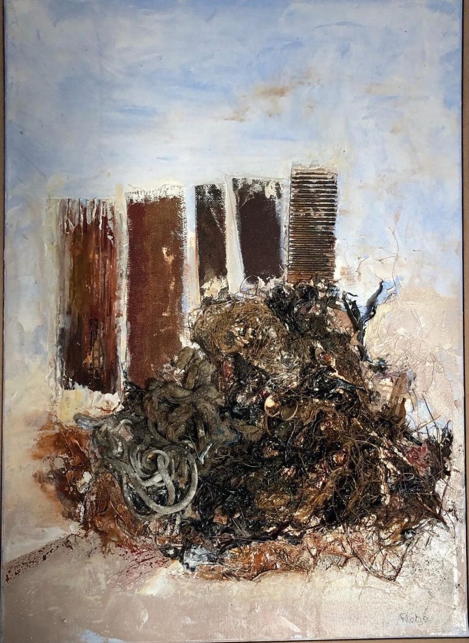 Mixed media met jutters materiaal als zeewier, touw en touw maar ook karton en jute.