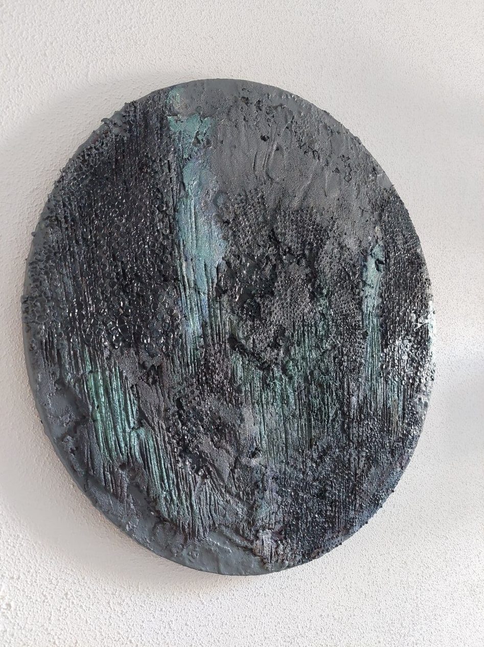 Parelmoerverf gebruikt wat een prachtige glans geeft. Het is een heel bijzonder schilderij wat echt een blikvanger zal zijn en helemaal past in deze tijd . Ronde schilderijen zijn op dit moment helemaal trendy.