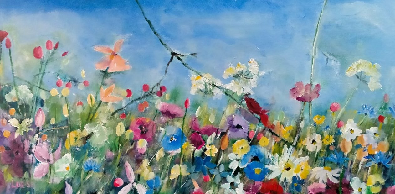 Een globale impressie van het schilderij "Veldbloemen" 140x60cm.