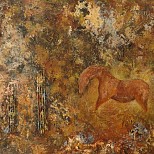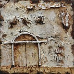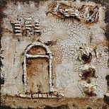 Een schilderij in acylverf opgebouwd uit verschillende elementen zoals karton, wol en kersenpitten. Wordt in een blankhouten baklijst aangeboden.