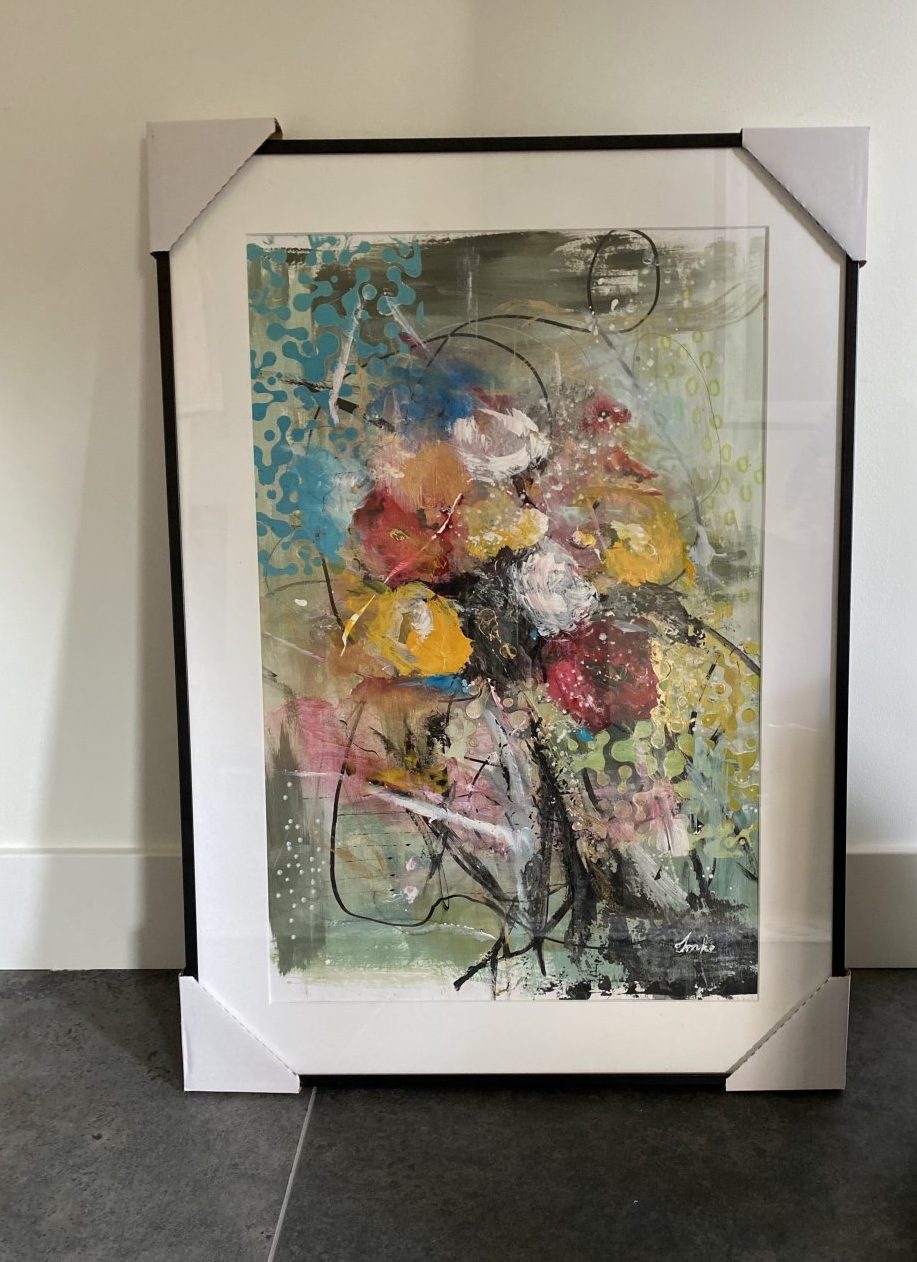Flowers for you, met paspartout en zwarte lijst, glasraam en ophangsysteem. Acryl op papier. Wil je dit kunstwerk bekijken of kopen ? Bij Totalhomeconcept in Lelystad kun je terecht.