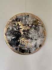 Rond canvas doek , mixed media art, met goud blad ,structuur pasta , ,acryl verf, afgewerkt met satin vernis . Rand afwerking met bladgoud. En ophang systeem.