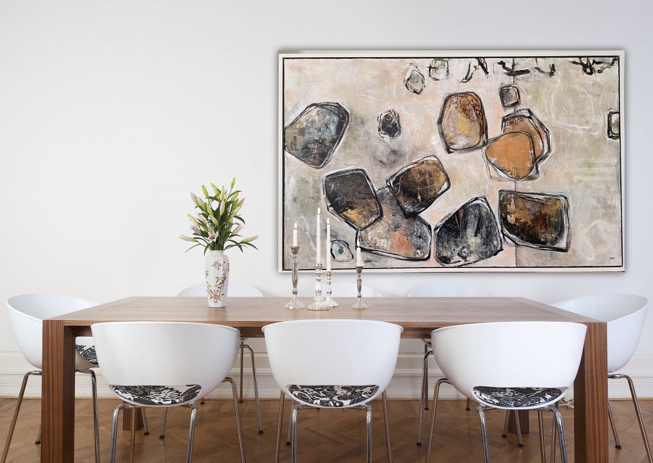 Stone Art. Formaat 105 x165 cm. Incl. Witte baklijst. Mixed media art. Met structuurpasta. Ophangsysteem. En afgelakt . Wil je dit kunstwerk bekijken of kopen, dit schilderij is geëxposeerd in de showroom van Totalhome in Lelystad.