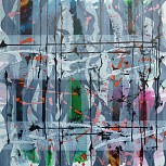 Abstract schilderij uitgevoerd in Olieverf en Inkt op Linnen. Gesigneerd en ingelijst in een stalen baklijst