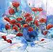 Een globale impressie van het schilderij "Vaas met klaprozen" 50x50cm.