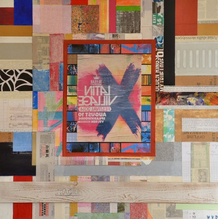 Kleurrijk, doch rustig, figuratief, abstract mixed media schilderij, opgebouwd uit diverse lagen (dekkend en transparant) en met verschillende materialen.